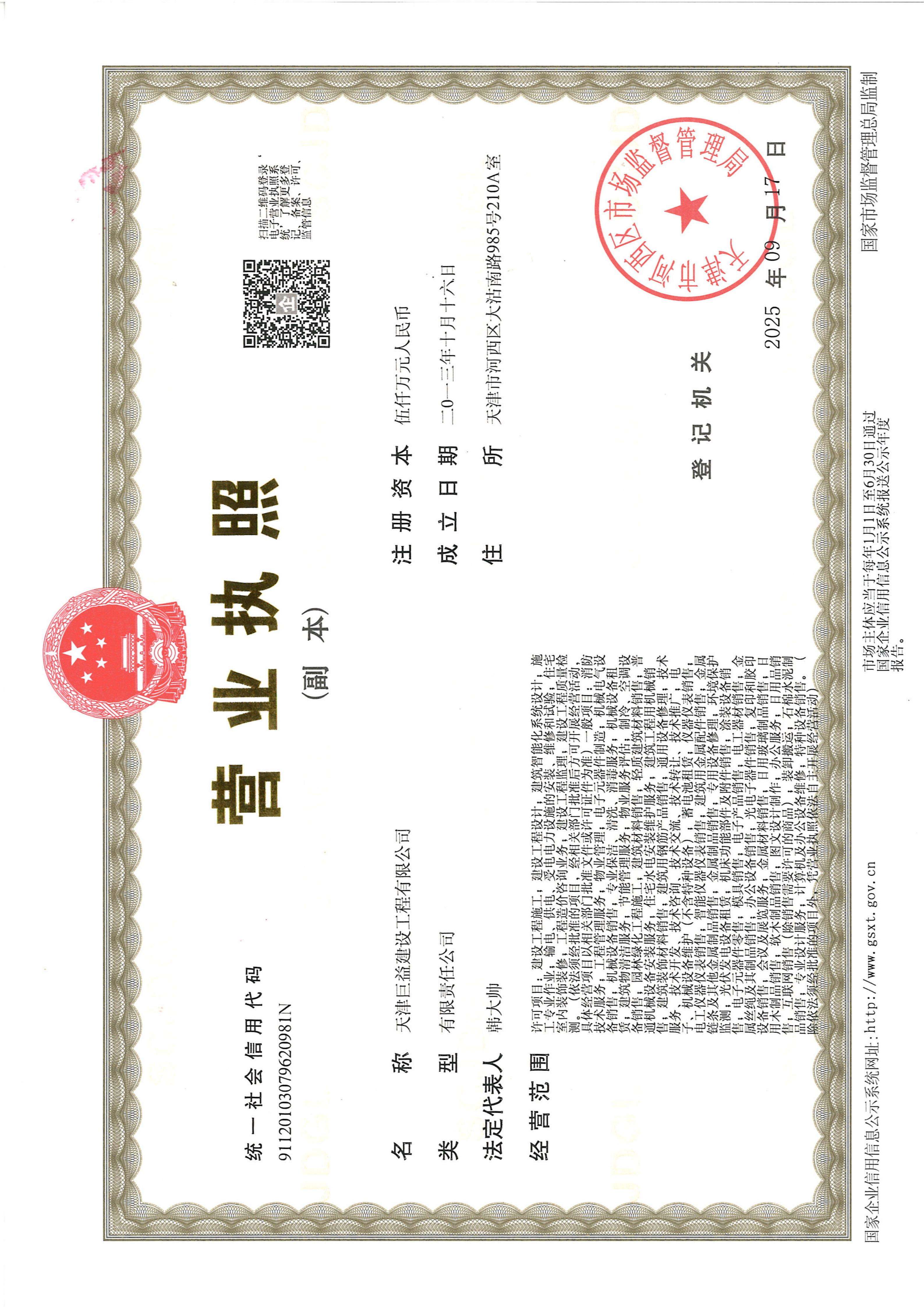 公司严格按现代企业制度进行管理,全面推行质量管理体系ISO9001;经过积累,目前具有天津市城乡建设委员会颁发企业资质有: 建筑工程施工总承包二级、机电工程施工总承包二级、电力工程施工总承包二级、环保工程专业承包二级、建筑机电安装工程专业承包一级、建筑装修装饰工程专业承包二级、输变电工程专业承包二级、电子与智能化工程专业承包二级、消防设施工程专业承包二级、施工劳务(备案事项)不分等级、电力工程承装承修承试四级等。同时完善了ISO各项资质认证,以及信用评价等工作。以及及中央空调清洗消毒证书、新风净化系统清洗消毒证书、诚信企业家荣誉证书、3A信用等级证书、质量服务信誉证书和中国设备维修安装企业能力登记证书、劳务派遣和人力资源服务许可证等。 |